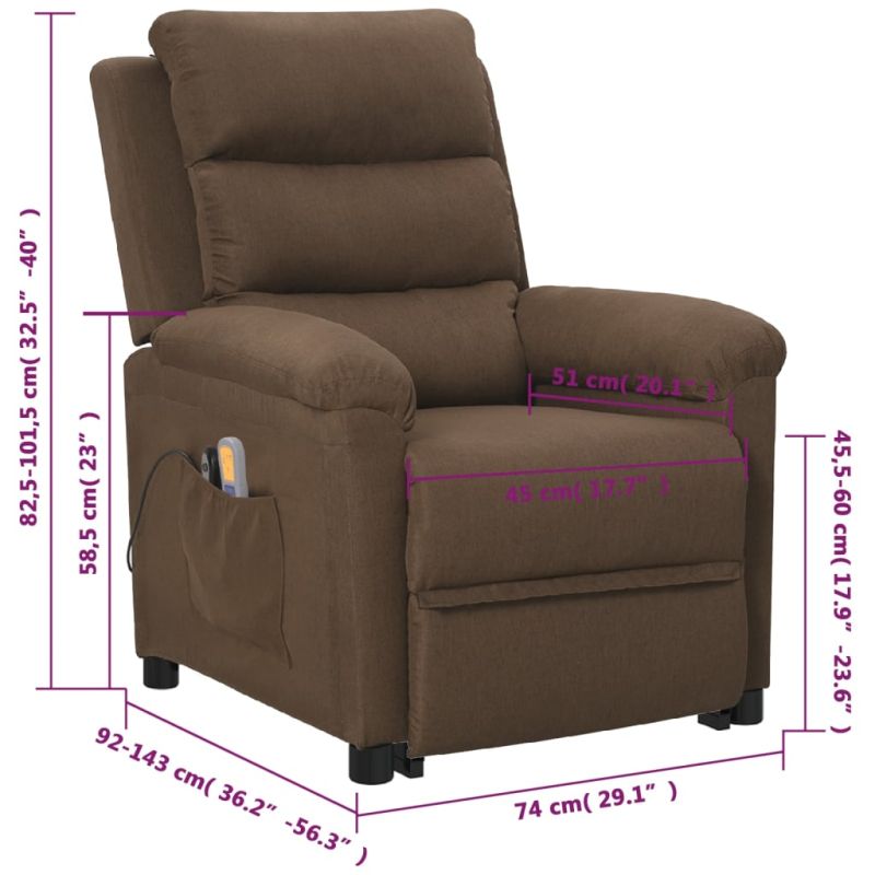 Облегнете се и се отпуснете в този изключително комфортен изправящ масажен стол! Функция за ръчно накланяне: Накланящият се стол е специално проектиран с 3 позиции на наклон, така че да можете да регулирате ръчно облегалката и поставката за крака според вашето удобство.Функция за повдигане: Този стол реклайнер е оборудван с електрически двигател с функция за повдигане. Благодарение на ръчното дистанционно управление с 2 бутона и функцията, която избутва целия стол нагоре, можете лесно да се изправите, без да натоварвате гърба и коленете си.Функция за вибрация: Представените 6 масажни точки ви позволяват да изпитате по-целенасочен масаж. Освен това включеното ръчно управление ви позволява да избирате различни програми за масаж. Функцията за масаж се захранва от USB конектора, но сертифицираният 5V USB източник на захранване не е включен.Удобно седене: Дебело подплатената седалка, облегалката и широките подлакътници, покрити с текстил, осигуряват уютно и топло усещане, което ви кара да се чувствате като в прегръдка, докато седите. Тъканта се отличава със семпъл и изчистен вид и е дишаща и издръжлива.Здрава и стабилна рамка: Рамката, изработена от дърво и метал, осигурява здрава структура и стабилност. Този накланящ се фотьойл е удобен и издръжлив.