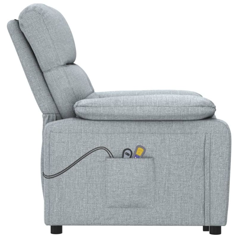 Облегнете се и се отпуснете в този изключително комфортен изправящ масажен стол! Функция за ръчно накланяне: Накланящият се стол е специално проектиран с 3 позиции на наклон, така че да можете да регулирате ръчно облегалката и поставката за крака според вашето удобство.Функция за повдигане: Този стол реклайнер е оборудван с електрически двигател с функция за повдигане. Благодарение на ръчното дистанционно управление с 2 бутона и функцията, която избутва целия стол нагоре, можете лесно да се изправите, без да натоварвате гърба и коленете си.Функция за вибрация: Представените 6 масажни точки ви позволяват да изпитате по-целенасочен масаж. Освен това включеното ръчно управление ви позволява да избирате различни програми за масаж. Функцията за масаж се захранва от USB конектора, но сертифицираният 5V USB източник на захранване не е включен.Удобно седене: Дебело подплатената седалка, облегалката и широките подлакътници, покрити с текстил, осигуряват уютно и топло усещане, което ви кара да се чувствате като в прегръдка, докато седите. Тъканта се отличава със семпъл и изчистен вид и е дишаща и издръжлива.Здрава и стабилна рамка: Рамката, изработена от дърво и метал, осигурява здрава структура и стабилност. Този накланящ се фотьойл е удобен и издръжлив.
