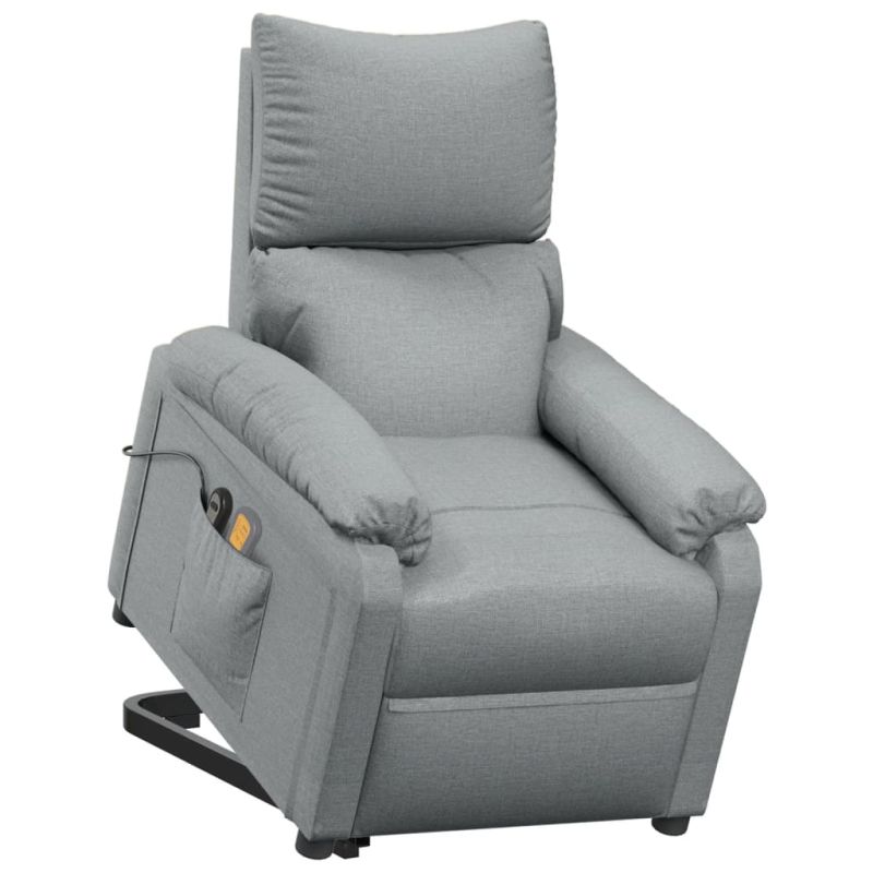 Облегнете се и се отпуснете в този изключително комфортен изправящ масажен стол! Функция за ръчно накланяне: Накланящият се стол е специално проектиран с 3 позиции на наклон, така че да можете да регулирате ръчно облегалката и поставката за крака според вашето удобство.Функция за повдигане: Този стол реклайнер е оборудван с електрически двигател с функция за повдигане. Благодарение на ръчното дистанционно управление с 2 бутона и функцията, която избутва целия стол нагоре, можете лесно да се изправите, без да натоварвате гърба и коленете си.Функция за вибрация: Представените 6 масажни точки ви позволяват да изпитате по-целенасочен масаж. Освен това включеното ръчно управление ви позволява да избирате различни програми за масаж. Функцията за масаж се захранва от USB конектора, но сертифицираният 5V USB източник на захранване не е включен.Удобно седене: Дебело подплатената седалка, облегалката и широките подлакътници, покрити с текстил, осигуряват уютно и топло усещане, което ви кара да се чувствате като в прегръдка, докато седите. Тъканта се отличава със семпъл и изчистен вид и е дишаща и издръжлива.Здрава и стабилна рамка: Рамката, изработена от дърво и метал, осигурява здрава структура и стабилност. Този накланящ се фотьойл е удобен и издръжлив.