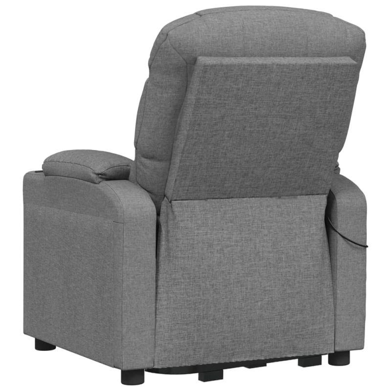 Облегнете се и се отпуснете в този изключително комфортен изправящ масажен стол! Функция за ръчно накланяне: Накланящият се стол е специално проектиран с 3 позиции на наклон, така че да можете да регулирате ръчно облегалката и поставката за крака според вашето удобство.Функция за повдигане: Този стол реклайнер е оборудван с електрически двигател с функция за повдигане. Благодарение на ръчното дистанционно управление с 2 бутона и функцията, която избутва целия стол нагоре, можете лесно да се изправите, без да натоварвате гърба и коленете си.Функция за вибрация: Представените 6 масажни точки ви позволяват да изпитате по-целенасочен масаж. Освен това включеното ръчно управление ви позволява да избирате различни програми за масаж. Функцията за масаж се захранва от USB конектора, но сертифицираният 5V USB източник на захранване не е включен.Удобно седене: Дебело подплатената седалка, облегалката и широките подлакътници, покрити с текстил, осигуряват уютно и топло усещане, което ви кара да се чувствате като в прегръдка, докато седите. Тъканта се отличава със семпъл и изчистен вид и е дишаща и издръжлива.Здрава и стабилна рамка: Рамката, изработена от дърво и метал, осигурява здрава структура и стабилност. Този накланящ се фотьойл е удобен и издръжлив.