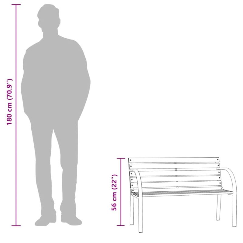 Тази дървена градинска пейка е идеално допълнение за вашата градина или всяко друго място на открито. Тази пейка с метална рамка ще внесе един изчистен стил, където и да я поставите. Изработени от издръжлив китаxски чам, ламелите на седалката и облегалката предлагат страхотна опора и оптимален комфорт. Два подлакътника ви осигуряват идеално място за почивка на уморените ви ръце. Тази пейка за домашна градина е подходяща за вашите деца с оглед на нейния размер. Те със сигурност ще си прекарат добре на тази прекрасна пейка. Забележка: За да удължите живота на вашите градински мебели, ви препоръчваме да ги защитите с водоустойчиво покритие.
