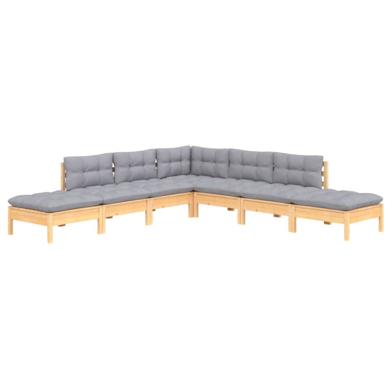 Градински лаундж комплект със сиви възглавници, 7 части, бор