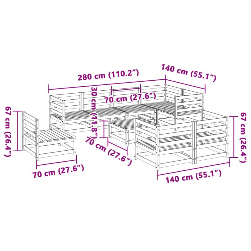 Този градински диван е идеалното допълнение към вашия заден двор, тераса или вътрешен двор, осигурявайки удобно и привлекателно пространство за разговори със семейството и приятелите или просто за почивка и забавление на открито. Здрав и издръжлив материал: Масивната борова дървесина е известна със своята здравина и издръжливост. Нейните прави зърна и отличителни възли допринасят за рустик чара ѝ.Добро проветряване и предотвратяване на образуването на натрупвания: Дизайнът на ламелите спомага за оптимален въздушен поток и ефективно предотвратява събирането на вода, като осигурява суха и удобна седалка.Модулен дизайн: Този комплект външни мебели има модулен дизайн, което го прави напълно гъвкав и лесен за преместване, така че можете да създадете персонализирана подредба на външни мебели. Добре е да се знае:За да сте сигурни, че вашите външни мебели ще останат красиви, ви препоръчваме да ги защитите с водоустойчиво покривало. Максимално 110 кг на седалка.