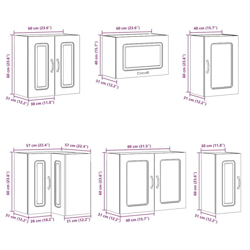 Този комплект кухненски шкафове от 11 части с елегантния си дизайн оптимизира кухненското ви пространство и осигурява достатъчно място за съхранение на вещите ви! Стабилен и издръжлив материал: Инженерната дървесина е издръжлив и стабилен материал с гладка повърхност, която е устойчива на влага, изкривяване и разцепване, което я прави надежден избор за различни проекти.Голямо пространство за съхранение: Комплектът кухненски шкафове има много отделения и предлага достатъчно място за съхранение на купи, чинии, тенджери и други кухненски уреди.Регулируеми крачета: Долните шкафове са снабдени с регулируеми крачета, чиято височина може да се регулира според разположението на кухнята.Лесна поддръжка: Благодарение на гладката си повърхност тези кухненски шкафове се почистват лесно с влажна кърпа и изискват по-малко поддръжка. Внимание:За да предотвратите преобръщане, този продукт трябва да се използва с предоставеното устройство за закрепване на стена. Добре е да се знае:Винт(ове) и щепсел(и) за вътрешността на стената не са включени. Търсете и използвайте винт(ове) и дюбел(и), подходящи за вашите стени. Ако не сте сигурни, потърсете професионална помощ. Прочетете и следвайте внимателно всяка стъпка от инструкциите.Работният плот, мивката и смесителят не са включени в доставката.