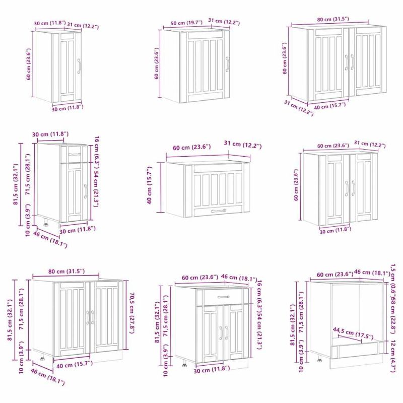 Този комплект кухненски шкафове от 14 части, с елегантния си дизайн, оптимизира кухненското ви пространство и осигурява достатъчно място за съхранение на вашите лични вещи! Стабилен и издръжлив материал: Инженерната дървесина е издръжлив и стабилен материал с гладка повърхност, устойчива на влага, деформация и цепене, което го прави надежден избор за различни проекти.Достатъчно място за съхранение: Комплектът кухненски шкафове има много отделения и предлага достатъчно място за съхранение на купи, чинии, тенджери и други кухненски уреди.Регулируеми крачета: Долните шкафове разполагат с регулируеми крачета, които могат да се регулират по височина, за да отговарят на оформлението на вашата кухня.Лесни за поддръжка: Благодарение на гладката си повърхност, тези кухненски шкафове се почистват лесно с влажна кърпа и изискват по-малко поддръжка. Предупреждение:Този продукт трябва да бъде обезопасен чрез монтиране на работен плот. Подходящ за имайте предвид:Винт(ове) и дюбели за вътрешната част на стената не са включени. Потърсете и използвайте винт(ове) и дюбели, подходящи за вашите стени. Ако не сте сигурни, потърсете професионален съвет. Прочетете и следвайте внимателно всяка стъпка от инструкциите.Плотът, мивката и смесителят не са включени в доставката.