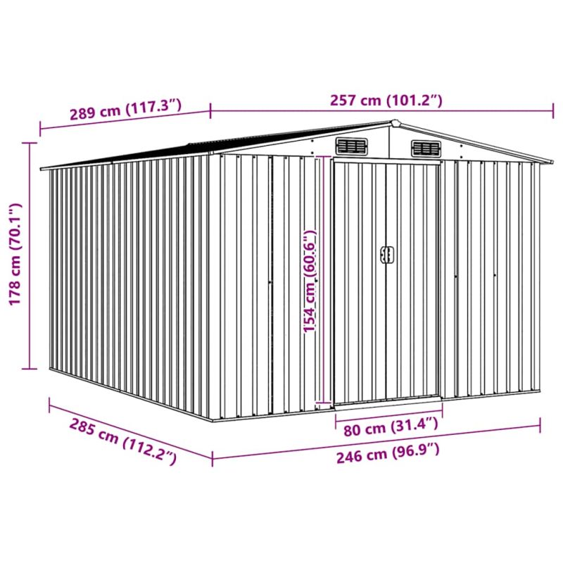 Нашият складов метален навес ще бъде идеален за съхранение на различни инструменти, градински мебели и градинско оборудване. Градинската барака не само предлага защита от замърсяване и прах, но и от вятър и климатични условия. Тази барака за съхранение има отвори както отпред, така и отзад, осигуряващи отлична вентилация. Двойните плъзгащи се врати отпред позволяват лесно влизане и излизане. Благодарение на конструкцията от прахово боядисана поцинкована стомана, бараката за съхранение на инструменти е издръжлива и здрава. Градинският складов навес изисква сглобяване.