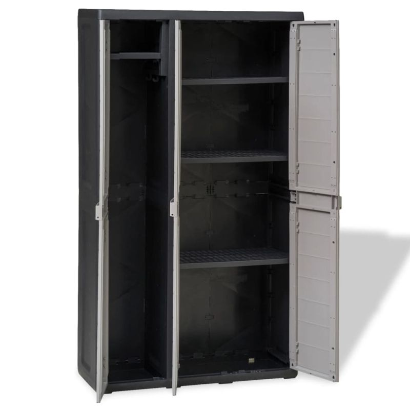 Градински шкаф за съхранение с 4 рафта, черно и сиво