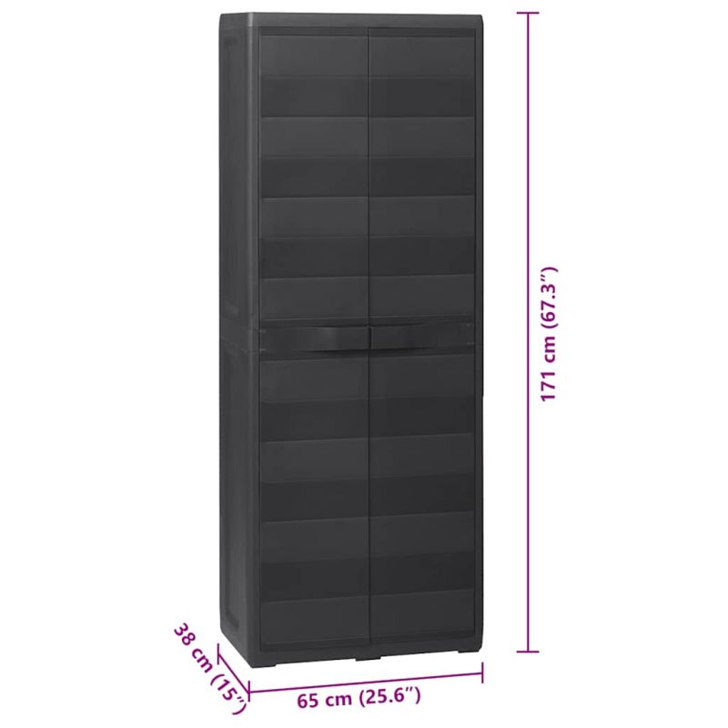 Нашият висококачествен шкаф за съхранение е идеален за организиране и съхраняване на вашите домакински пособия, инструменти или други предмети в градината, вътрешния двор и т.н. С класическия си дизайн този шкаф ще се впише във всеки декор. Този TÜV-GS сертифициран шкаф е изработен от здрав, издръжлив полипропилен (PP). Шкафът за съхранение има рафтове с добра проветряемост, които могат да бъдат настроени така, че да побират предмети с различни размери. Градинският шкаф може да бъде заключен с катинар за допълнителна безопасност (катинарът не е включен). Този градински шкаф за съхранение е много лесен за почистване. Градинският шкаф има компактен дизайн и ще предложи максимално от ограниченото пространство. Сглобяването е лесно.