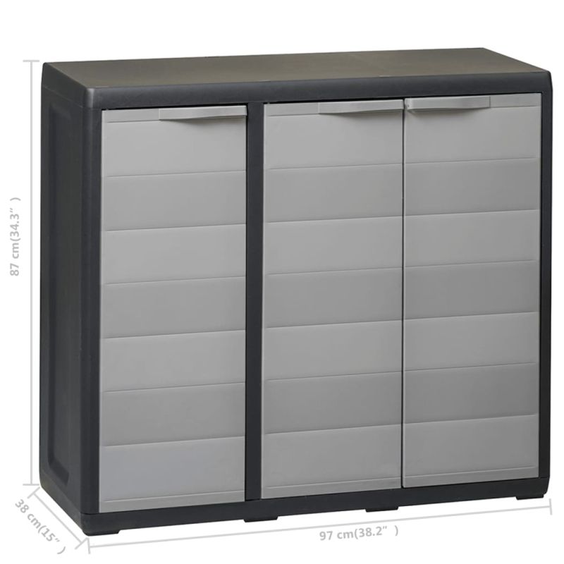 Градински шкаф за съхранение с 2 рафта, черно и сиво