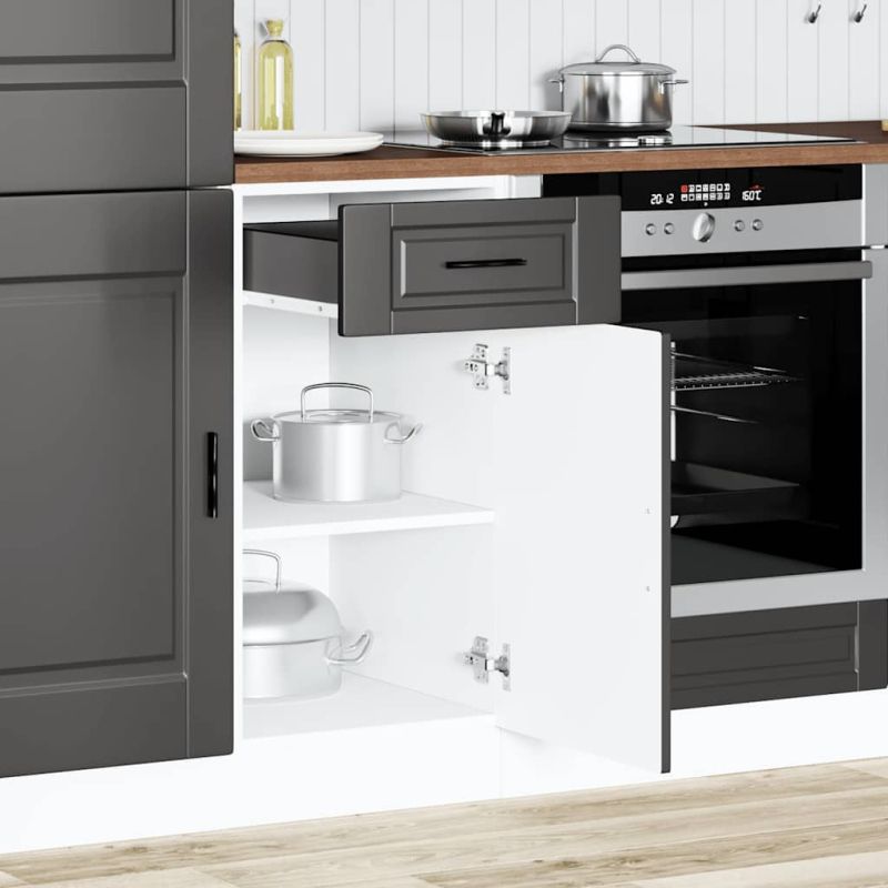 Този кухненски шкаф оптимизира пространството в кухнята ви, като осигурява достатъчно място за съхранение на личните ви вещи! Стабилен и издръжлив материал: Инженерната дървесина е издръжлив и стабилен материал с гладка повърхност, която е устойчива на влага, изкривяване и разцепване, което я прави надежден избор за различни проекти.Голямо пространство за съхранение: Основният кухненски шкаф предлага достатъчно място за съхранение на купи, чинии, тенджери и други кухненски уреди.Практични врати: Вратата помага за поддържането на чисто и организирано пространство, като скрива кухненските уреди и разхвърляните вещи зад тях.Регулируеми крачета: Крачетата на този шкаф могат да се регулират по височина, за да отговарят на разположението на кухнята ви.Лесна поддръжка: Благодарение на гладката си повърхност този кухненски шкаф се почиства лесно с влажна кърпа и изисква по-малко поддръжка. Внимание:За да предотвратите преобръщане, този продукт трябва да се използва с предоставеното устройство за закрепване на стена. Добре е да се знае:Винт(ове) и щепсел(и) за вътрешността на стената не са включени. Търсете и използвайте винт(ове) и дюбел(и), подходящи за вашите стени. Ако не сте сигурни, потърсете професионална помощ. Прочетете и следвайте внимателно всяка стъпка от инструкциите.