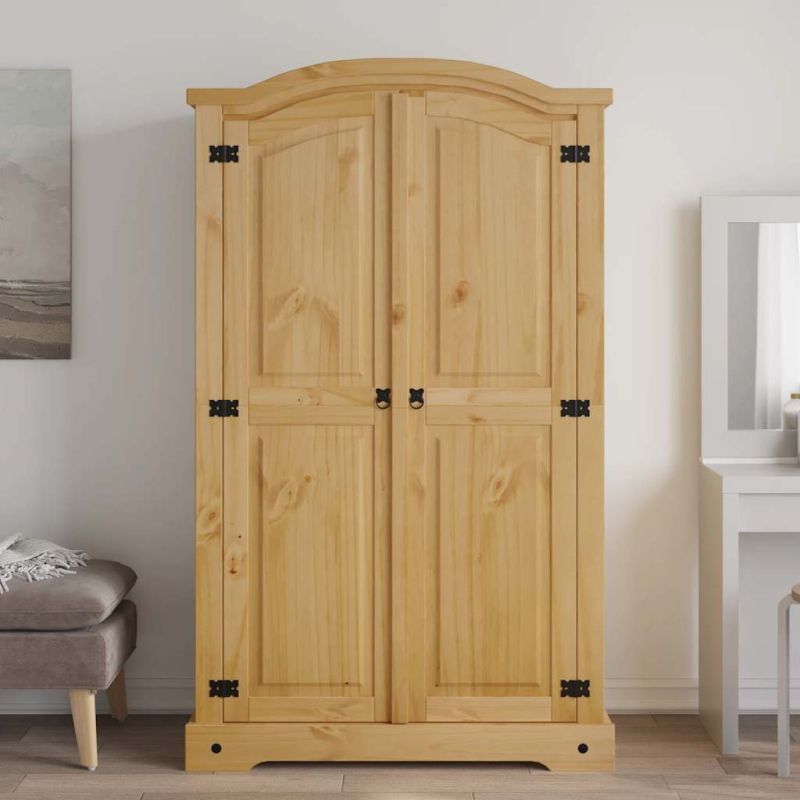 Този висококачествен дървен гардероб е мебел в мексиканския стил Корона. Полираният бор с черни метални детайли излъчва рустикален мексикански чар, който ще направи гардероба чудесно допълнение към вашата спалня или гардеробна. Гардеробът е с красив куполен дизайн и 2 врати. Изработен от масивна борова дървесина, той е здрав и стабилен. Шкафът разполага с голямо пространство за съхранение с един горен рафт и един лост за окачване, осигурявайки много място за организиране на вашите дрехи. Сглобяването е наистина лесно.