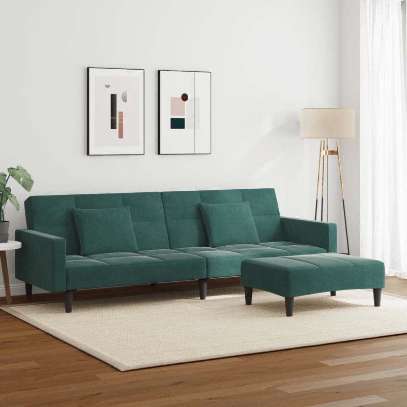 2-местно разтегателно канапе с табуретка, тъмнозелено, кадифе