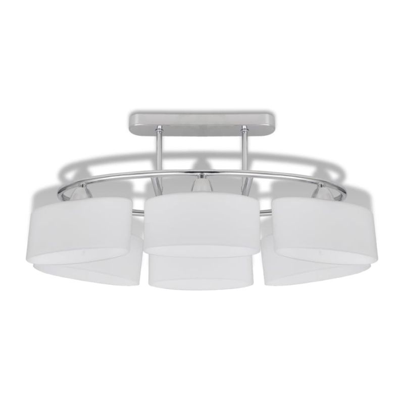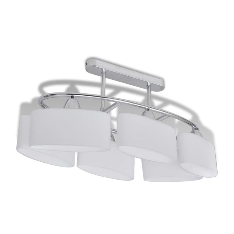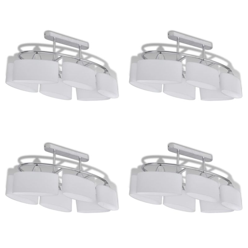 Тази уникална плафониера с шест стъклени абажура се отличава с модерен дизайн. Хромираното покритие придава на тази лампа съвременен стил - идеална за всекидневна или спалня с независимо какъв стил. Тази лампа може лесно да се монтира на всеки таван с висококачествена паралелепипедна метална основа. Чудесна светлина ще проникне през тези деликатни елипсовидни абажури, осветявайки всеки ъгъл на стаята. Тази изключителна лампа за таван се отличава със своята семпла и приятна визия. Тази лампа е подходяща за шест крушки E14. Моля, имайте предвид, че крушките не са включени в доставката. Доставката включва 4 лампи.