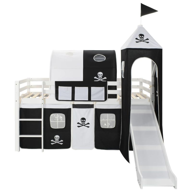 Това тематично детско легло за принцеси ще бъде страхотен акцент в детската стая. Леглото на второто ниво има солидна конструкция и се доставя с подматрачната рамка, пързалка, стълба, тематична пиратска палатка, странично покритие и козирка. Предпазните бариери в двата края на леглото ще пазят малкия ви пират в леглото му. Пространството под леглото се превръща в главната квартира на капитана с включените странични стени с прозорци. В допълнение, леглото на второто ниво се отличава със забавни пързалка и стълба, като и двете могат да бъдат покрити с включената палатка. Пързалката и стълбата могат да бъдат сглобени отляво или отдясно, като е включена и козирка за покриване на леглото. Леглото е подходящо за матрак 90 x 200 см. Вашият малчуган ще обича да спи и да играе в собствената си пиратска крепост! Моля, обърнете внимание, че матракът не е включен в доставката.