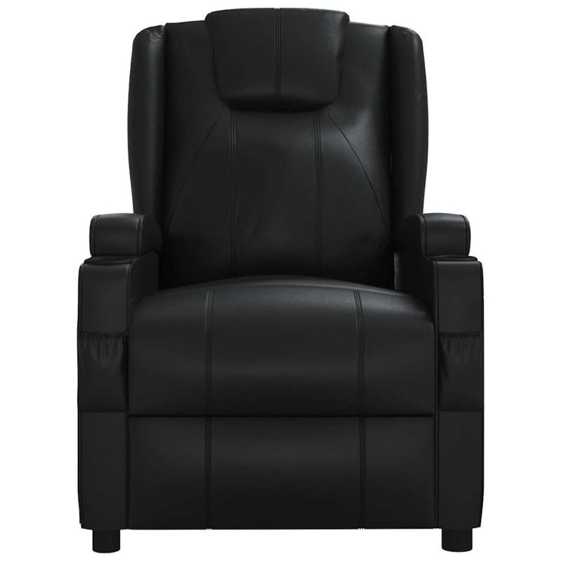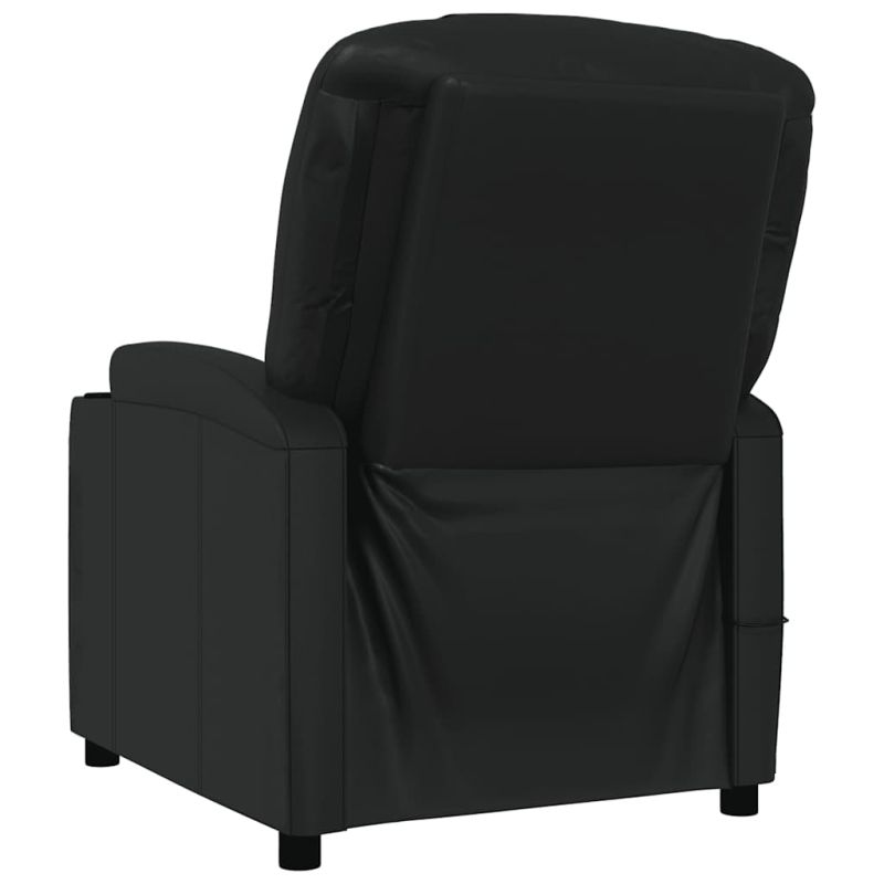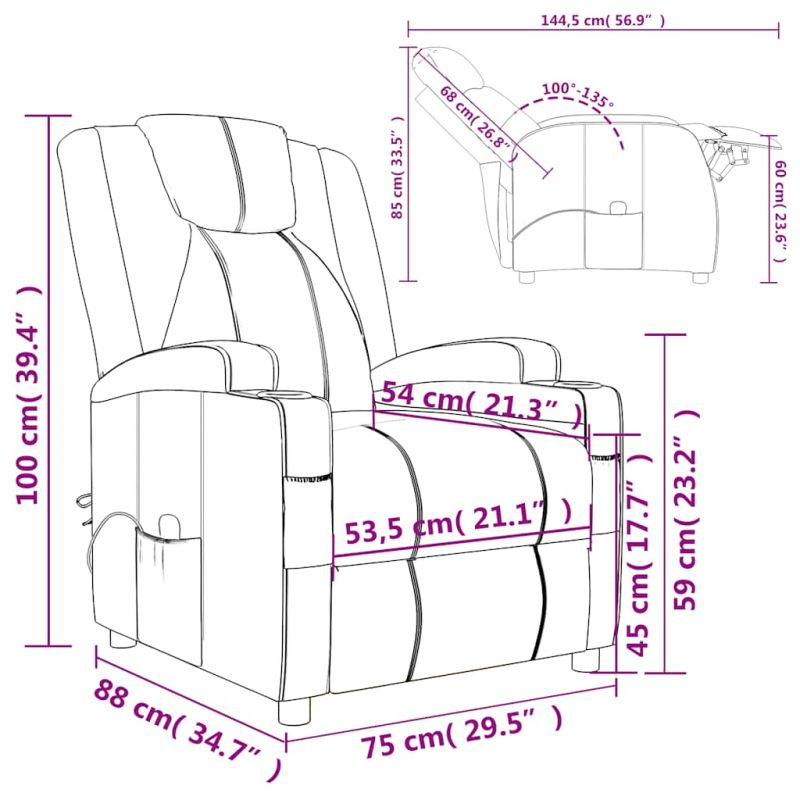 Облегнете се и се отпуснете в този изключително комфортен масажен стол! Функция за ръчно накланяне: Накланящият се стол е специално проектиран с 3 позиции на наклон, така че да можете да регулирате ръчно облегалката и поставката за крака според вашето удобство.Функция за вибрация: Представените 6 масажни точки ви позволяват да изпитате по-целенасочен масаж. Освен това включеното ръчно управление ви позволява да избирате различни програми за масаж. Функцията за масаж се захранва от USB конектора, но сертифицираният 5V USB източник на захранване не е включен.Удобно седене: Дебело подплатената седалка, облегалката и широките подлакътници, покрити с изкуствена кожа, осигуряват уютно и топло усещане, което ви кара да се чувствате като в прегръдка, докато седите. Изкуствената кожа е много издръжлив материал. Устойчива е на петна, което я прави лесна за почистване с влажна кърпа. Гладката повърхност също така придава луксозен вид и красотата на истинската кожа.Здрава и стабилна рамка: Рамката, изработена от дърво и метал, осигурява здрава структура и стабилност. Този накланящ се фотьойл е удобен и издръжлив.