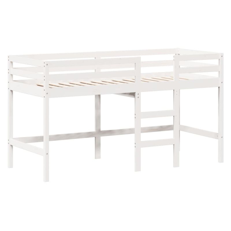 Това детско високо легло е изработено от борова дървесина масив и е предназначено както за забавление, така и за оптимизиране на пространството. Масивна борова дървесина: Масивната борова дървесина е красив естествен материал. Боровата дървесина е с продълговати шарки, а чеповете придават на материала характерния му рустик вид.Пълно използване на пространството: Това единично високо легло е повдигнато на 78,5 см над земята, осигурявайки достатъчно пространство отдолу за съхранение или други дейности. Тази зона може да се използва за подреждане на кутии за съхранение, съхраняване на големи играчки или дори за поставяне на детски диван за четене. Освен това вашето дете може да използва пространството под дървената рамка на леглото като тайна база и да се наслаждава на въображаема игра.Предпазни парапети: Детската спалня със средна височина се предлага с предпазни парапети от всичките 4 страни, така че детето ви да може да спи, без да се притеснявате, че ще падне.Удобна стълба: Това детско средно легло има стълба, която осигурява удобство за качване и слизане от леглото. Освен това носи радост и превръща стаята им в закрита детска площадка.Отворена странична врата: Покривът разполага с отворена странична врата, осигуряваща лесен достъп за вашите деца да влизат и стават от леглото. Добре е да се знае:Към това легло не е включен матрак. Ние предлагаме разнообразна селекция от матраци. Можете да проверите нашия магазин за подходящ матрак. Внимание:За да предотвратите преобръщане, този продукт трябва да се използва с предоставеното устройство за закрепване на стена.