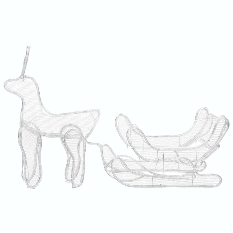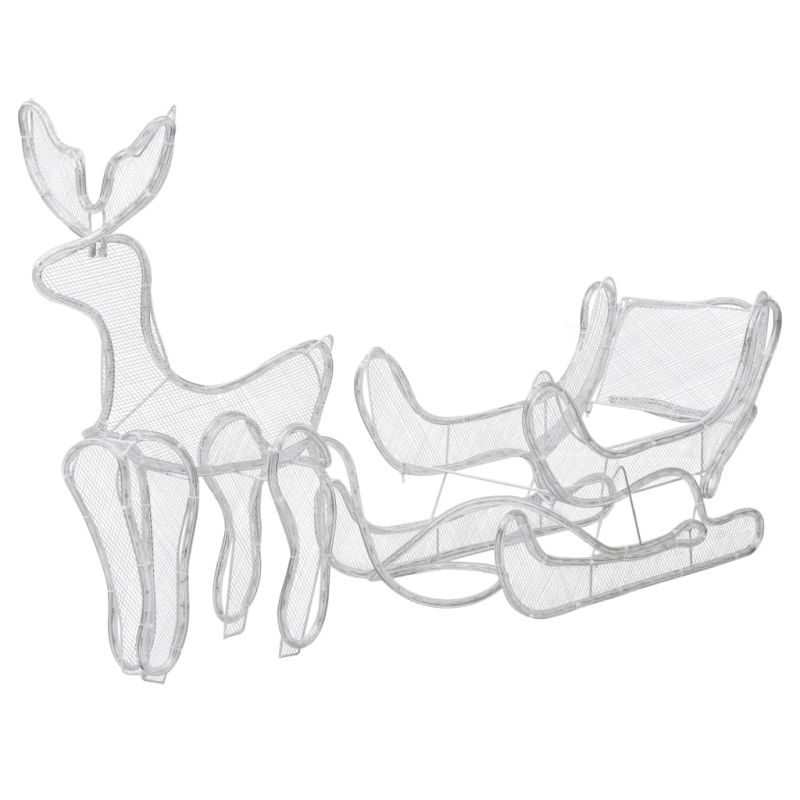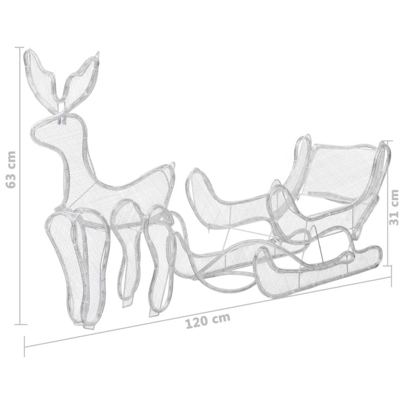 Това впечатляващо светещо коледно осветление във формата на елен и шейна, изработено от мрежа със светодиоди, е перфектна декорация. Композицията е изработена от PVC и стоманена рамка. Лампичките излъчват нежни блещукащи светлинки през нощта, добавяйки елегантност на фигурата. Тази прекрасна коледна украса е водоустойчива, което я прави подходяща както за вътрешна, така и за външна употреба. Тя със сигурност е чудесен подарък за вашето семейство и приятели през предстоящата Коледа. Моля, обърнете внимание: Щепселът е включен в доставката. За безопасност използвайте светещия кабел само в комбинация с ДТЗ (дефектнотокова защита) (не е включен).