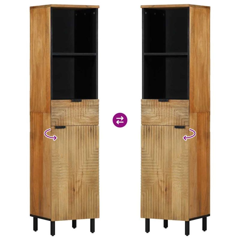 Този шкаф за баня е чудесен избор за вашата баня, като я прави подредена и организирана! Здрав и стабилен материал: Масивното мангово дърво, здрава тропическа твърда дървесина, е силно предпочитано за производството на мебели поради изключителната си издръжливост и здравина. Красивите ѝ дървесни шарки правят всяка мебел малко по-различна от следващите.Достатъчно място за съхранение: Шкафът за съхранение за баня предлага достатъчно място за лесно поставяне на вашите основни тоалетни принадлежности и артикули за баня като сапуни, шампоан, паста за зъби и др.Дървени крачета: Дървените крачета придават на мебелите за баня естествен и приятен вид, като същевременно осигуряват стабилност.Атрактивен външен вид: Забележителният дизайн на шкафа за баня подобрява цялостния облик на помещението с плавните си линии и изискани шарки, превръщайки го в акцента на всяка стая. Добре е да се знае:Всеки артикул е уникален с вариации в цветове и зърна. Доставката е на случаен принцип, което гарантира ексклузивността и индивидуалността на вашия продукт. Внимание:За да предотвратите преобръщане, този продукт трябва да се използва с предоставеното устройство за закрепване на стена.