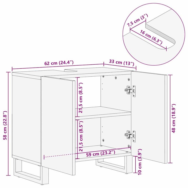 Този модернен шкаф за мивка е универсално допълнение за всяка баня, комбинирайки функционалност и стил. Изработен от масивно мангово дърво, предлага естествена и уютна визия, която подхожда на всякакви предложения за багаж. Правоъгълната форма и компактният му дизайн го правят идеален за малки до средни бани. С елегантно кафяво покритие, той е отлично допълнение към тоалетното помещение и предлага достатъчно място за важни неща. Здравата конструкция гарантира дълготрайност и практичност. Перфектен е за ценители на устойчивост и стил - това не е просто решение за съхранение, а изявление за всяко дома. Материал: Изработен от масивно мангово дърво, този шкаф внася природата у дома. Предлага отлична издръжливост и устойчивост на ежедневна употреба. Текстурираната повърхност подчертава естествената красота на дървото, създавайки уютна атмосфера в банята. Този материал е не само красив, но и екологичен. Включени компоненти: Доставя се като едно цяло изделие, за да улесни монтажа. Осигурява голяма повърхност за мивка и достатъчно място отдолу за подреждане на важни вещи. Специално проектираните отсечки поддържат всичко подредено - от тоалетни принадлежности до хавлии. Характеристики: Целият шкаф е проектиран да устоява на влажна среда. С течение на времето качеството му остава стабилно, без да губи външния си вид. Простият стил привлича хора, които търсят естетика и издръжливост. Препоръчителни употреби: Подходящ е за традиционни и модерни бани, този шкаф успешно се адаптира към различни пространства, предлагайки стил и практичност. Идеален е за тези, които търсят функционално решение в ограничени пространства или елегантен акцент в по-просторни бани. Поддръжка и чистене: Лесен за поддържане - просто избърсвайте с влажна кърпа. Така поддържате елегантния вид и запазвате естествената красота на дървото. Избягвайте агресивни химикали.