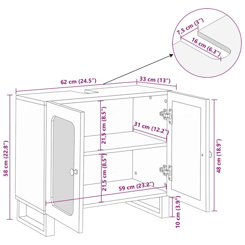 Този модернен шкаф за мивка е универсално допълнение за всяка баня, комбинирайки функционалност и стил. Изработен от масивно мангово дърво, предлага естествена и уютна визия, която подхожда на всякакви предложения за багаж. Правоъгълната форма и компактният му дизайн го правят идеален за малки до средни бани. С елегантно кафяво покритие, той е отлично допълнение към тоалетното помещение и предлага достатъчно място за важни неща. Здравата конструкция гарантира дълготрайност и практичност. Перфектен е за ценители на устойчивост и стил - това не е просто решение за съхранение, а изявление за всяко дома. Материал: Изработен от масивно мангово дърво, този шкаф внася природата у дома. Предлага отлична издръжливост и устойчивост на ежедневна употреба. Текстурираната повърхност подчертава естествената красота на дървото, създавайки уютна атмосфера в банята. Този материал е не само красив, но и екологичен. Включени компоненти: Доставя се като едно цяло изделие, за да улесни монтажа. Осигурява голяма повърхност за мивка и достатъчно място отдолу за подреждане на важни вещи. Специално проектираните отсечки поддържат всичко подредено - от тоалетни принадлежности до хавлии. Характеристики: Целият шкаф е проектиран да устоява на влажна среда. С течение на времето качеството му остава стабилно, без да губи външния си вид. Простият стил привлича хора, които търсят естетика и издръжливост. Препоръчителни употреби: Подходящ е за традиционни и модерни бани, този шкаф успешно се адаптира към различни пространства, предлагайки стил и практичност. Идеален е за тези, които търсят функционално решение в ограничени пространства или елегантен акцент в по-просторни бани. Поддръжка и чистене: Лесен за поддържане - просто избърсвайте с влажна кърпа. Така поддържате елегантния вид и запазвате естествената красота на дървото. Избягвайте агресивни химикали.