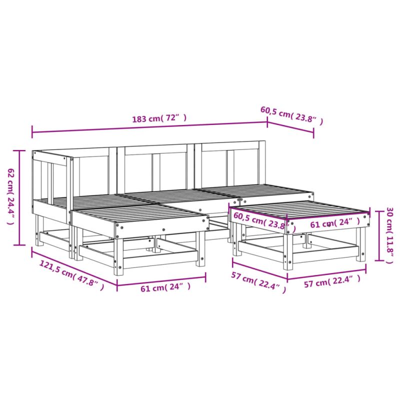 Този дървен градински лаундж комплект, който се откроява с дизайн на летви, ще бъде чудесно допълнение към вашата градина, вътрешен двор или тераса, за да се насладите на уютно време със семейството или приятелите си. Масивна борова дървесина: Масивната борова дървесина е красив естествен материал. Боровата дървесина е с продълговати шарки, а чеповете придават на материала характерния му рустик вид.Здрава и стабилна рамка: Дървените рамки правят лаундж комплекта здрав и стабилен за ежедневна употреба на открито.Модулен дизайн: Комплектът мебели е гъвкав и лесен за преместване. Можете да я комбинирате с други модулни сегменти в уеб магазина, за да създадете свои лични конфигурации на градински лаундж комплект! Добре е да се знае:За да сте сигурни, че вашите външни мебели ще останат красиви, ви препоръчваме да ги защитите с водоустойчиво покривало.Възглавниците не са включени в доставката.