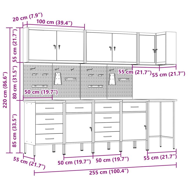 Този универсален комплект за стенен шкаф за инструменти и перфорационна дъска е задължителен за всяка работилница или гараж. С елегантен индустриален дизайн, той носи градски стил с прахово боядисаното желязо и гладкия сив завършек. Предназначен за вътрешна употреба, шкафът предлага надеждно решение за съхранение на инструменти, осигурявайки бърз достъп, а интегрираната перфорационна дъска добавя функционалност с възможност за персонализиране на разпределението на инструментите. Материали: Изработен от здраво прахово боядисано желязо, този комплект шкафове съчетава здравина и стил. Гладката текстура и сивият завършек придават модерен индустриален вид и дълготрайност, а също така се вписват лесно в различни интериорни теми. Обширни компоненти: Комплектът включва метални рафтове от прахово боядисано желязо, осигуряващи стабилно съхранение, което не се отказва при тежест и редовно използване. С перфорационните дъски, потребителите могат лесно да организират инструментите си, оптимизирайки пространството за всякакви видове инструменти. Функционален дизайн и стил: С конструкция, която може да се монтира на стена, шкафът освобождава ценното пространство на пода, което го прави идеален за работилници или гаражи, където е нужна ефективна организация. Това помага в усилията за поддържане на подредено и чисто работно място. Гъвкави възможности за използване: Перфектен за професионални работилници, но и супер удобен за домашни гаражи или DIY пространства. Тази адаптивност позволява на потребителите лесно да се придвижват между различни среди и проекти. Лесни инструкции за поддръжка: Поддържането на шкафа е лесно - просто го бърсиш със суха кърпа, за да запазиш изисканото му изглеждане. Простите стъпки за почистване гарантират продължително задоволство и дълготрайност на шкафа.
