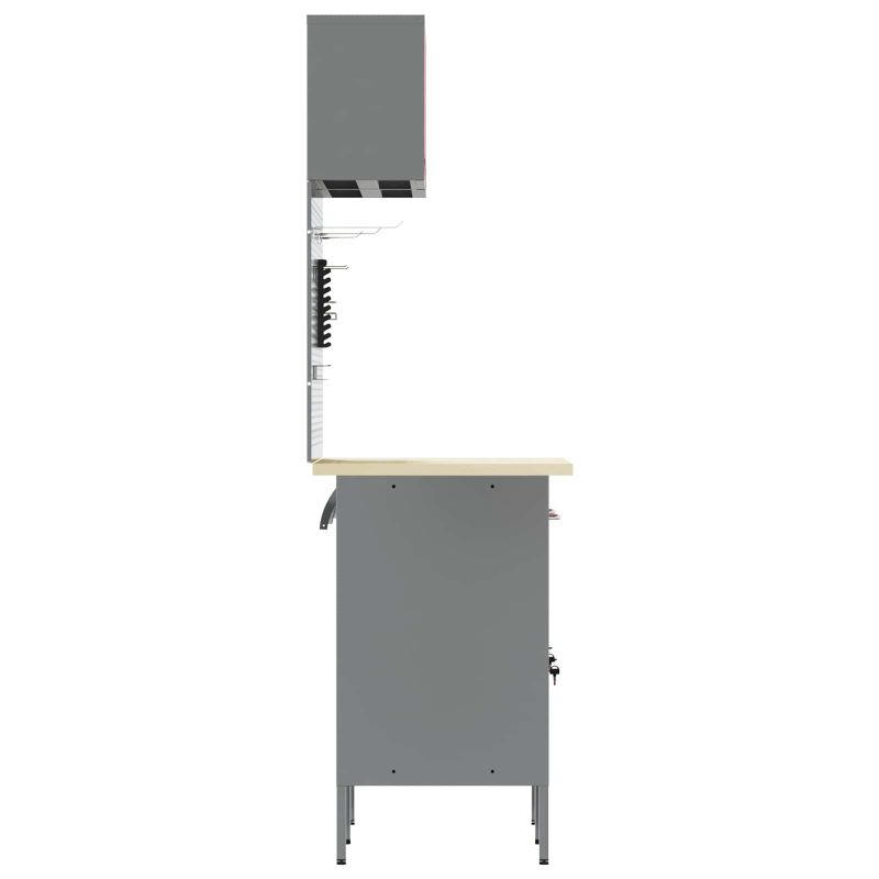 Този здрав комплект работни шкафове е идеалната комбинация от полезност и изглед, с модерен правоъгълен дизайн. Той е подходящ за всеки, който цени естетиката и реда. Шкафът е лесен за използване и предлага много възможности за съхранение на инструменти - поддържа всичко чисто и подредено! Материали: Стоманата и инженерната дървесина предлагат здрава и дълготрайна конструкция. Стоманата осигурява защита, докато дървото добавя стил. Включени компоненти: Ръчно регулируемите крачета позволяват корекция в зависимост от височината, улесняваща работата. Дизайн: Правоъгълната форма е идеално решение за управление на пространството с минималистичен вид. Препоръчителни употреби: Подходящи за всякакви работилници, тези шкафове предлагат удобство при организирането на инструменти и аксесоари. Грижа и поддръжка: Лесно сглобяване с необходима отвертка; следвайте указанията на производителя за дълготрайност.