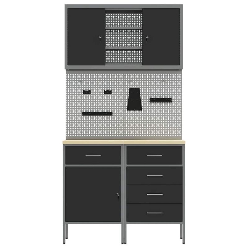 Този здрав комплект работни шкафове е идеалната комбинация от полезност и изглед, с модерен правоъгълен дизайн. Той е подходящ за всеки, който цени естетиката и реда. Шкафът е лесен за използване и предлага много възможности за съхранение на инструменти - поддържа всичко чисто и подредено! Материали: Стоманата и инженерната дървесина предлагат здрава и дълготрайна конструкция. Стоманата осигурява защита, докато дървото добавя стил. Включени компоненти: Ръчно регулируемите крачета позволяват корекция в зависимост от височината, улесняваща работата. Дизайн: Правоъгълната форма е идеално решение за управление на пространството с минималистичен вид. Препоръчителни употреби: Подходящи за всякакви работилници, тези шкафове предлагат удобство при организирането на инструменти и аксесоари. Грижа и поддръжка: Лесно сглобяване с необходима отвертка; следвайте указанията на производителя за дълготрайност.