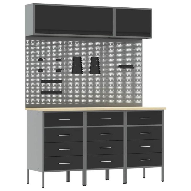 Този здрав комплект работни шкафове е идеалната комбинация от полезност и изглед, с модерен правоъгълен дизайн. Той е подходящ за всеки, който цени естетиката и реда. Шкафът е лесен за използване и предлага много възможности за съхранение на инструменти - поддържа всичко чисто и подредено! Материали: Стоманата и инженерната дървесина предлагат здрава и дълготрайна конструкция. Стоманата осигурява защита, докато дървото добавя стил. Включени компоненти: Ръчно регулируемите крачета позволяват корекция в зависимост от височината, улесняваща работата. Дизайн: Правоъгълната форма е идеално решение за управление на пространството с минималистичен вид. Препоръчителни употреби: Подходящи за всякакви работилници, тези шкафове предлагат удобство при организирането на инструменти и аксесоари. Грижа и поддръжка: Лесно сглобяване с необходима отвертка; следвайте указанията на производителя за дълготрайност.
