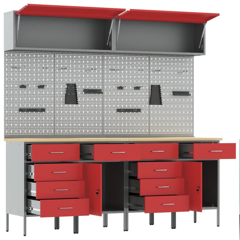 Този здрав комплект работни шкафове е идеалната комбинация от полезност и изглед, с модерен правоъгълен дизайн. Той е подходящ за всеки, който цени естетиката и реда. Шкафът е лесен за използване и предлага много възможности за съхранение на инструменти - поддържа всичко чисто и подредено! Материали: Стоманата и инженерната дървесина предлагат здрава и дълготрайна конструкция. Стоманата осигурява защита, докато дървото добавя стил. Включени компоненти: Ръчно регулируемите крачета позволяват корекция в зависимост от височината, улесняваща работата. Дизайн: Правоъгълната форма е идеално решение за управление на пространството с минималистичен вид. Препоръчителни употреби: Подходящи за всякакви работилници, тези шкафове предлагат удобство при организирането на инструменти и аксесоари. Грижа и поддръжка: Лесно сглобяване с необходима отвертка; следвайте указанията на производителя за дълготрайност.