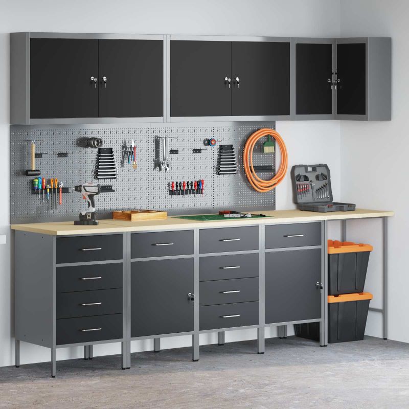 Комплектът работни шкафове е здраво и стилно решение за организиране на инструментите в работилницата ви. Със своя модерен и минималистичен дизайн, той съчетава практичност с визуална привлекателност, правейки всяка работилница да изглежда подредена и професионална. Материали: Този комплект е направен от прахово боядисана стомана и инженерна дървесина, осигурявайки здраво решение за съхранение. Материалите са избрани за своята издръжливост, а праховата боя гарантира защита от износване. Включени компоненти: Включва различни отделения за съхранение и камърни брави, което позволява лесен достъп и безопасност на инструментите. Тази система прави комплекта наистина ценен за всяко работно място. Регулируемите крака на шкафа увеличават стабилността на неравни повърхности. Характеристики/Функция/Дизайн: Модерният му дизайн е прост и функционален, лесно се вписва в различни работилнични стилистики. Чистите линии предлагат изискан вид и практично пространство за инструменти. Регулируемите крака позволяват настройки според вашите нужди. Препоръчителни употреби: Проектиран основно за вътрешна употреба, той е чудесен за работилници, където е важна организацията. Подходящ е за професионални работни места и домашни гаражи, където подредените инструменти подобряват достъпа и продуктивността. Грижа и поддръжка: За сглобяване са нужни двама души и отвертка за точност. Редовната поддръжка включва проверка на бравите и регулиране на краката, когато е необходимо, за да се запази стабилността и функционалността.