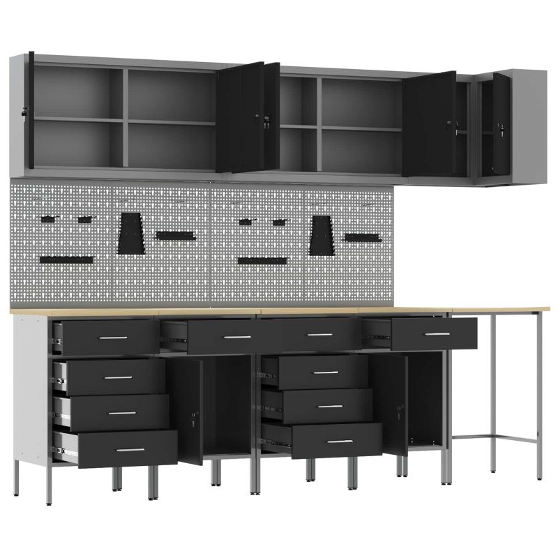 Комплект работни шкафове с чекмедже с рафт 12 pcs Черен и Сив