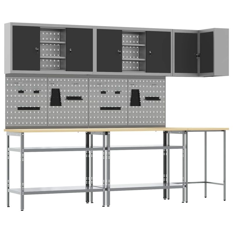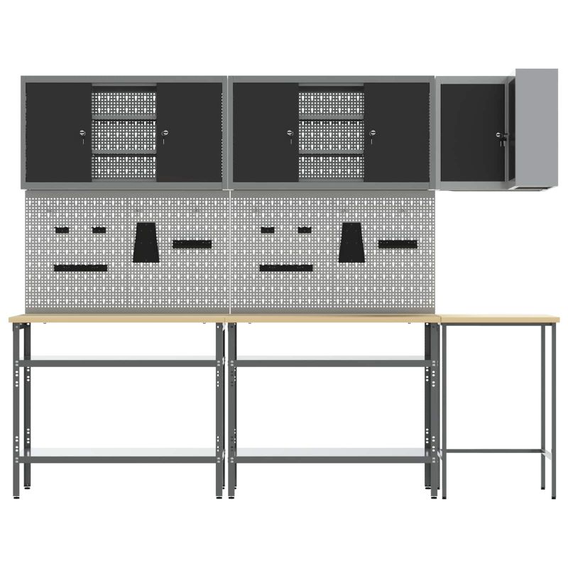 Комплектът работни шкафове е здраво и стилно решение за организиране на инструментите в работилницата ви. Със своя модерен и минималистичен дизайн, той съчетава практичност с визуална привлекателност, правейки всяка работилница да изглежда подредена и професионална. Материали: Този комплект е направен от прахово боядисана стомана и инженерна дървесина, осигурявайки здраво решение за съхранение. Материалите са избрани за своята издръжливост, а праховата боя гарантира защита от износване. Включени компоненти: Включва различни отделения за съхранение и камърни брави, което позволява лесен достъп и безопасност на инструментите. Тази система прави комплекта наистина ценен за всяко работно място. Регулируемите крака на шкафа увеличават стабилността на неравни повърхности. Характеристики/Функция/Дизайн: Модерният му дизайн е прост и функционален, лесно се вписва в различни работилнични стилистики. Чистите линии предлагат изискан вид и практично пространство за инструменти. Регулируемите крака позволяват настройки според вашите нужди. Препоръчителни употреби: Проектиран основно за вътрешна употреба, той е чудесен за работилници, където е важна организацията. Подходящ е за професионални работни места и домашни гаражи, където подредените инструменти подобряват достъпа и продуктивността. Грижа и поддръжка: За сглобяване са нужни двама души и отвертка за точност. Редовната поддръжка включва проверка на бравите и регулиране на краката, когато е необходимо, за да се запази стабилността и функционалността.