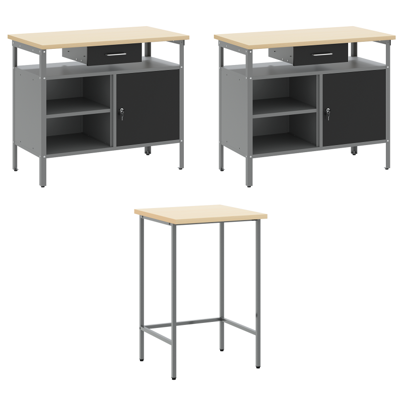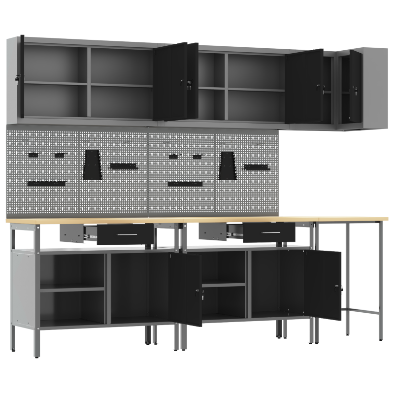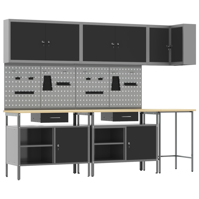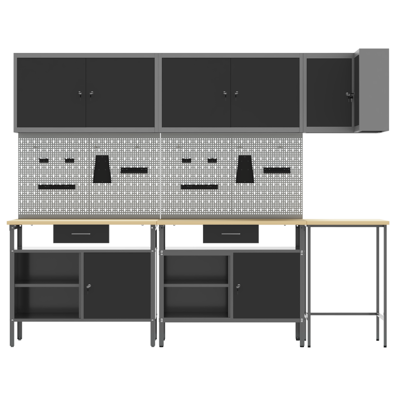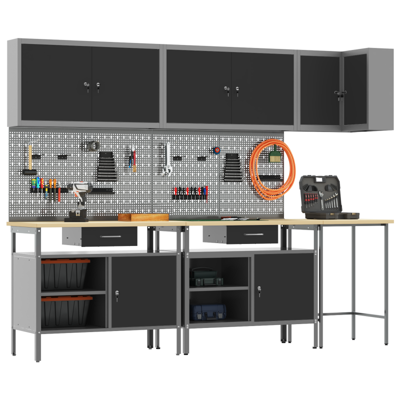 Комплектът работни шкафове е здраво и стилно решение за организиране на инструментите в работилницата ви. Със своя модерен и минималистичен дизайн, той съчетава практичност с визуална привлекателност, правейки всяка работилница да изглежда подредена и професионална. Материали: Този комплект е направен от прахово боядисана стомана и инженерна дървесина, осигурявайки здраво решение за съхранение. Материалите са избрани за своята издръжливост, а праховата боя гарантира защита от износване. Включени компоненти: Включва различни отделения за съхранение и камърни брави, което позволява лесен достъп и безопасност на инструментите. Тази система прави комплекта наистина ценен за всяко работно място. Регулируемите крака на шкафа увеличават стабилността на неравни повърхности. Характеристики/Функция/Дизайн: Модерният му дизайн е прост и функционален, лесно се вписва в различни работилнични стилистики. Чистите линии предлагат изискан вид и практично пространство за инструменти. Регулируемите крака позволяват настройки според вашите нужди. Препоръчителни употреби: Проектиран основно за вътрешна употреба, той е чудесен за работилници, където е важна организацията. Подходящ е за професионални работни места и домашни гаражи, където подредените инструменти подобряват достъпа и продуктивността. Грижа и поддръжка: За сглобяване са нужни двама души и отвертка за точност. Редовната поддръжка включва проверка на бравите и регулиране на краката, когато е необходимо, за да се запази стабилността и функционалността.