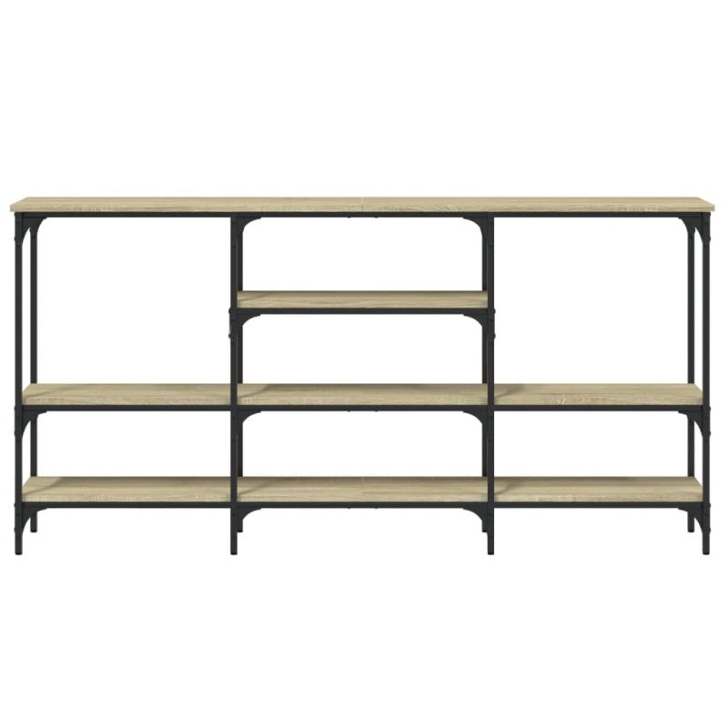 Добавете нотка елегантност към вашето антре, всекидневна или коридор с тази стилна конзолна маса. Издържлив материал: Инженерната дървесина е с изключително качество с гладка повърхност и също така се отличава със здравина, стабилност и устойчивост на влага. Изработена от инженерно дърво, холната маса е лесна за почистване.Достатъчно място за съхранение: Холната маса с няколко рафта предлага достатъчно място за съхранение, за да съхранявате вашите списания, книги, декоративни предмети и други ежедневни неща добре организирани и на достъпно място.Регулируеми крачета: Регулируемите крачета с пластмасови подложки поддържат страничната масичка балансирана на неравен терен и увеличават стабилността.Метална рамка: Металната рамка добавя индустриален стил към вашия интериор, като същевременно гарантира издръжливост и стабилност. Внимание:За предотвратяване на преобръщане този продукт трябва да се използва с предоставения анкер за стена.