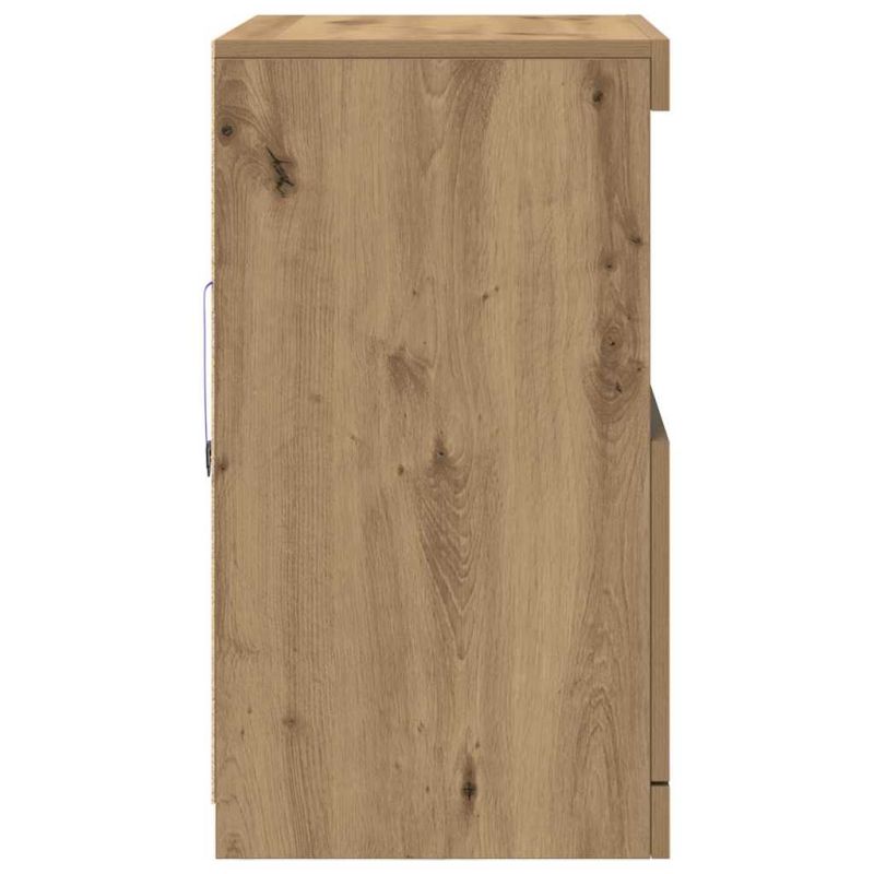 Този модерен LED страничен шкаф съчетава оригинален дизайн и практична функция, идеален за домове, които ценят стилния вид и полезността. С изчистени, минималистични линии, той добавя свежа, модерна нотка в трапезарии и всекидневни. Със своето RGB LED осветление, шкафът създава динамична атмосфера, правейки го атрактивен акцент при вечерни събирания. Създаден за почитателите на добрия дизайн и ефективността, шкафът предлага разнообразно пространство за съхранение, което поддържа изчистен вид, идеален за модерните домове, търсещи стил и практичност. Стилна и модерен вид Този LED страничен шкаф представя минималистичен и елегантен стил, който се вписва чудесно във всевъзможни интериорни решения. Чистите линии и черните акценти го правят забележителен елемент в всяка стая. Разнообразно осветление С RGB LED ленти, шкафът предлага множество опции за осветление, които подобряват атмосферата на дома ви. Независимо дали е вечеря или просто разпускане, осветлението ще зададе перфектното настроение. Издръжлив дизайн С качествени материали като инженерна и масивна регенерирана дървесина, шкафът осигурява дълготрайност. Комбинацията от тези материали увеличава здравината и намалява износването с времето. Обмислено съхранение С рафтове и панелни врати, този шкаф отговаря на множество нужди за съхранение, предоставяйки достатъчно пространство за организиране на важни вещи. Лесен достъп С функции като LED осветление, което се активира с бутон и удобни стоманени дръжки, достъпът става лесен, подобрявайки взаимодействието с мебелите.