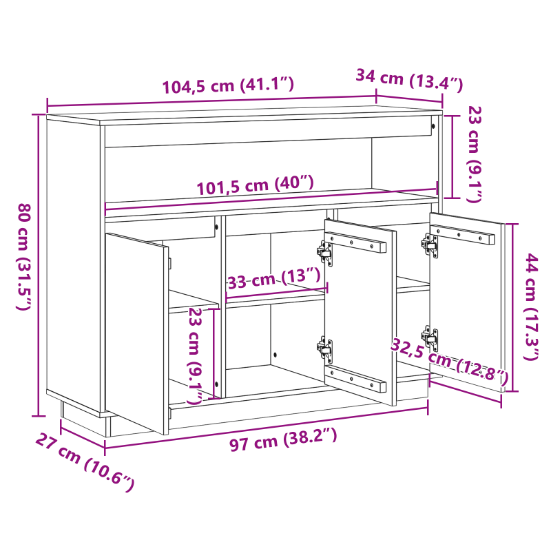 Този модерен дървен шкаф е проектиран да комбинира функционалност и стил. Изработен за вътрешна употреба, той изглежда страхотно в дневните, предлагаща достатъчно място за основни вещи или展示装饰物。С простия си дизайн, той носи спокойна атмосфера и удобно се вписва в модерни и традиционни интериори. Здраво строителство: Шкафът е изработен от масивна борова дървесина, която осигурява надеждна структура за ежедневна употреба. Масивната борова дървесина е известна със своята издръжливост, гарантираща стабилност и добър външен вид с годините. Сложен дизайн: Шкафът залага на модерен стил с простота и функционалност. Неговата правоъгълна форма и чисти линии на естетиката безпроблемно се вписват в различни стили, повишавайки визията на стаята без да натоварват останалите мебели. Плоски врати: Шкафът разполага с гладки, плоски врати, които лесно се отварят, разкривайки мястото за съхранение. Тези врати допринасят за запазване на удобен и съвременен вид в интериора. Щедри размери: С размери 104.5 x 34 x 80 см, шкафът предлага достатъчно пространство за основни неща, от съдове до медийни аксесоари. Тази просторна вътрешност отговаря на много нужди от съхранение, подчертавайки практичното му приложение в всяко жизнено пространство. Инструкции за монтаж: За монтажа са нужни двама възрастни с отвертка. Този лесен процес гарантира, че шкафът е стабилен и готов за употреба, предоставяйки удобство и спокойствие относно неговата структура.