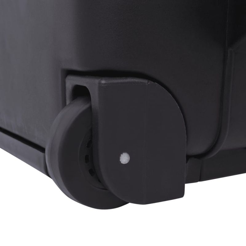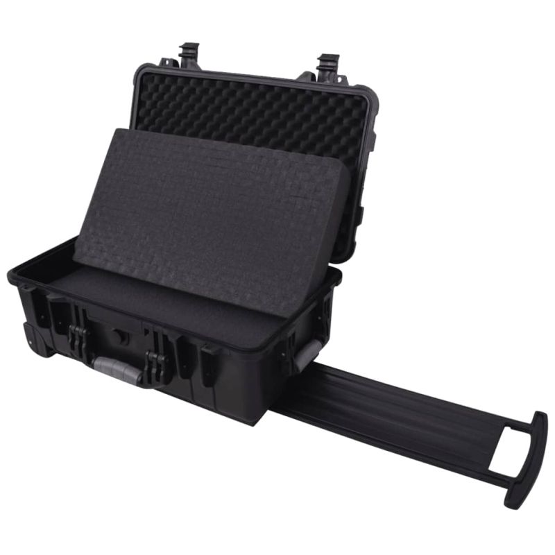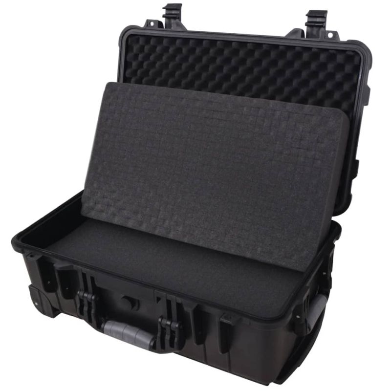 Тази кутия за инструменти на колелца с вътрешна облицовка от пяна е изработена от здрав, устойчив на издраскване и натрупване на прах, водоустойчив полипропилен. На дъното на кутията има тънък слой от полиуретанова пяна, действаща като подложка. Има и две слоя от много плътна пяна, които да създадат устойчивост и максимална защита на съдържанието. Кутията има и две колелца и регулируема телескопична дръжка, за повече комфорт при пътуване. Черният и завършек я прави подходяща за ползване години напред. Може да се заключва с два катинара за максимална защита (катинарите не са включени). Перфектно решение за съхранение и транспортиране на вашите електронни устройства, аудио и видео оборудване, микрофони, кабели, компютри, музикални аксесоари и др.