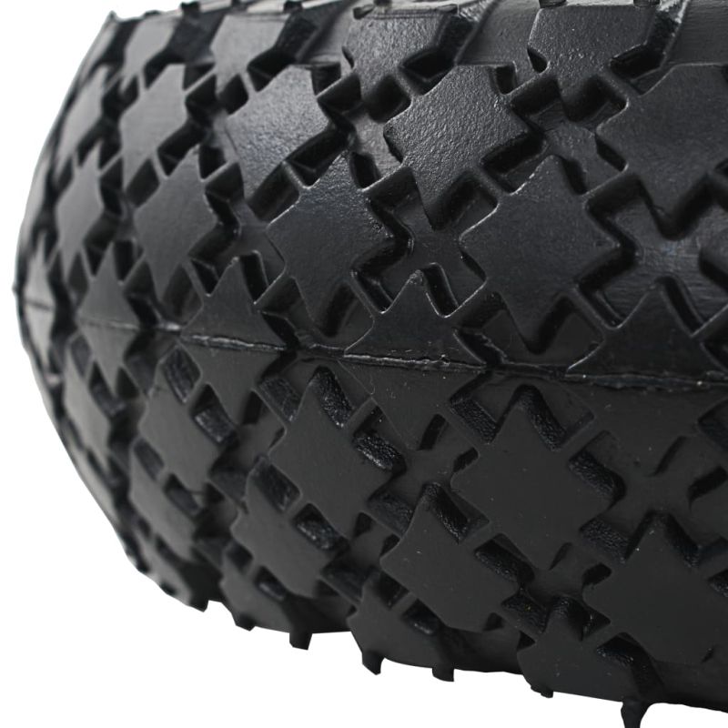 Тези непробиваеми резервни колела за транспортна количка са идеални за тежък режим на работа при преместване на товари с транспортни колички, товарни колички, колички за багаж, платформени колички, ръчни колички и др., дори и по груба настилка. Пневматичните гуми са изработени от здрава, устойчива на износване гума и имат специален дизайн на грайферите, който осигурява допълнително сцепление при по-високи скорости. Джантите са произведени от здрав метал. Колелата са с универсален размер и могат лесно да бъдат монтирани на вашите ръчни транспортни колички, багажни колички и др. Доставката включва 2 колела.