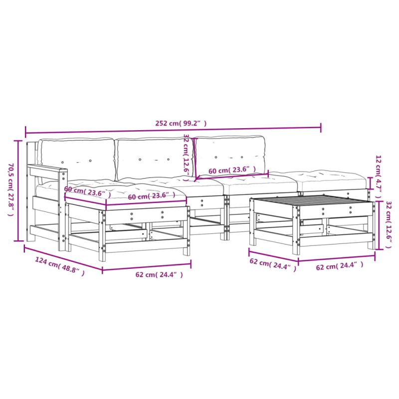 Този дървен градински лаундж комплект, който се отличава с дизайн на летви и меки възглавници, ще бъде чудесно допълнение към вашата градина, вътрешен двор или тераса, за да се насладите на уютно време със семейството или приятелите си. Масивна борова дървесина: Масивната борова дървесина е красив естествен материал. Боровата дървесина е с продълговати шарки, а чеповете придават на материала характерния му рустик вид.Здрава и стабилна рамка: Дървената рамка прави лаундж комплекта здрав и стабилен за ежедневна употреба на открито.Удобно седене: Облегалката и подлакътника добавят повече комфорт при седене на градинския комплект мебели. Освен това дебело подплатените възглавници осигуряват комфорт по време на седене.Модулен дизайн: Комплектът мебели е гъвкав и лесен за преместване. Можете да я комбинирате с други модулни сегменти в уеб магазина, за да създадете свои лични конфигурации на градински лаундж комплект! Добре е да се знае:За да сте сигурни, че вашите външни мебели ще останат красиви, ви препоръчваме да ги защитите с водоустойчиво покривало.