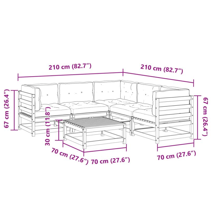 Градински комплект, 6 части, с възглавници, масив бор