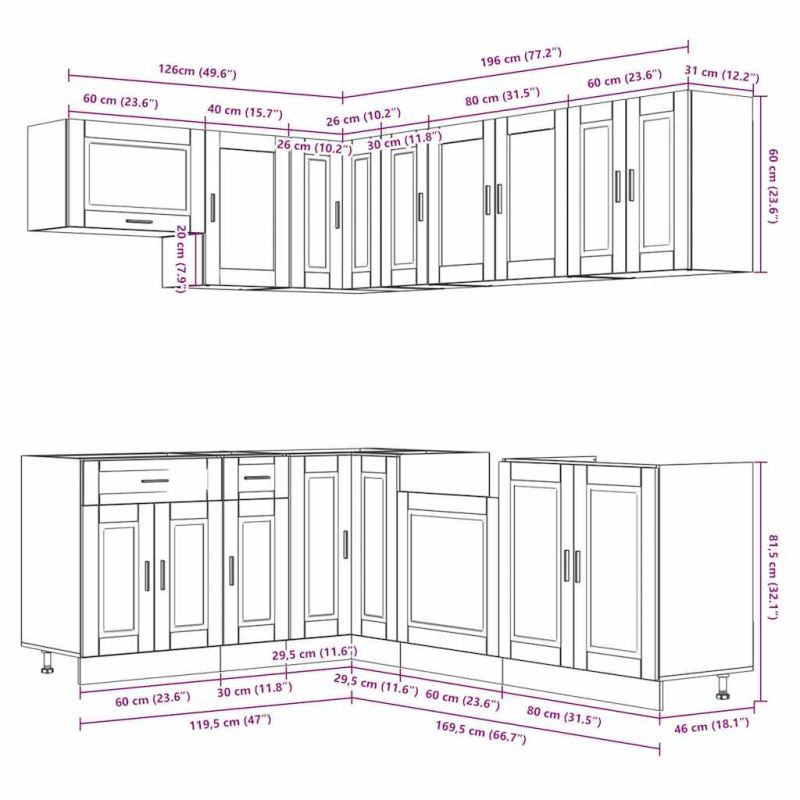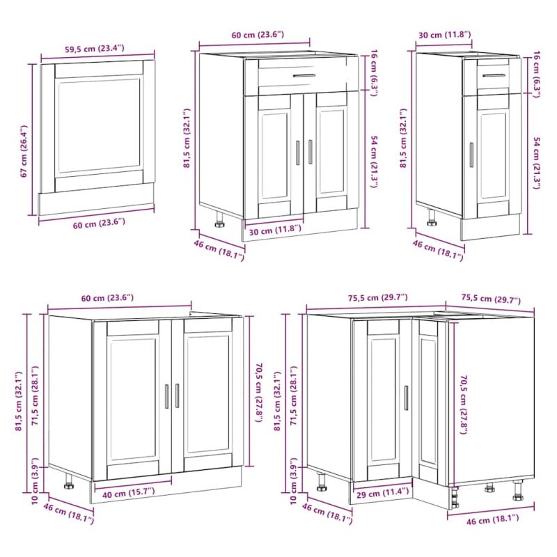 Този комплект кухненски шкафове от 11 части с елегантния си дизайн оптимизира кухненското ви пространство и осигурява достатъчно място за съхранение на вещите ви! Стабилен и издръжлив материал: Инженерната дървесина е издръжлив и стабилен материал с гладка повърхност, която е устойчива на влага, изкривяване и разцепване, което я прави надежден избор за различни проекти.Голямо пространство за съхранение: Комплектът кухненски шкафове има много отделения и предлага достатъчно място за съхранение на купи, чинии, тенджери и други кухненски уреди.Регулируеми крачета: Долните шкафове са снабдени с регулируеми крачета, чиято височина може да се регулира според разположението на кухнята.Лесна поддръжка: Благодарение на гладката си повърхност тези кухненски шкафове се почистват лесно с влажна кърпа и изискват по-малко поддръжка. Внимание:За да предотвратите преобръщане, този продукт трябва да се използва с предоставеното устройство за закрепване на стена. Добре е да се знае:Винт(ове) и щепсел(и) за вътрешността на стената не са включени. Търсете и използвайте винт(ове) и дюбел(и), подходящи за вашите стени. Ако не сте сигурни, потърсете професионална помощ. Прочетете и следвайте внимателно всяка стъпка от инструкциите.Работният плот, мивката и смесителят не са включени в доставката.