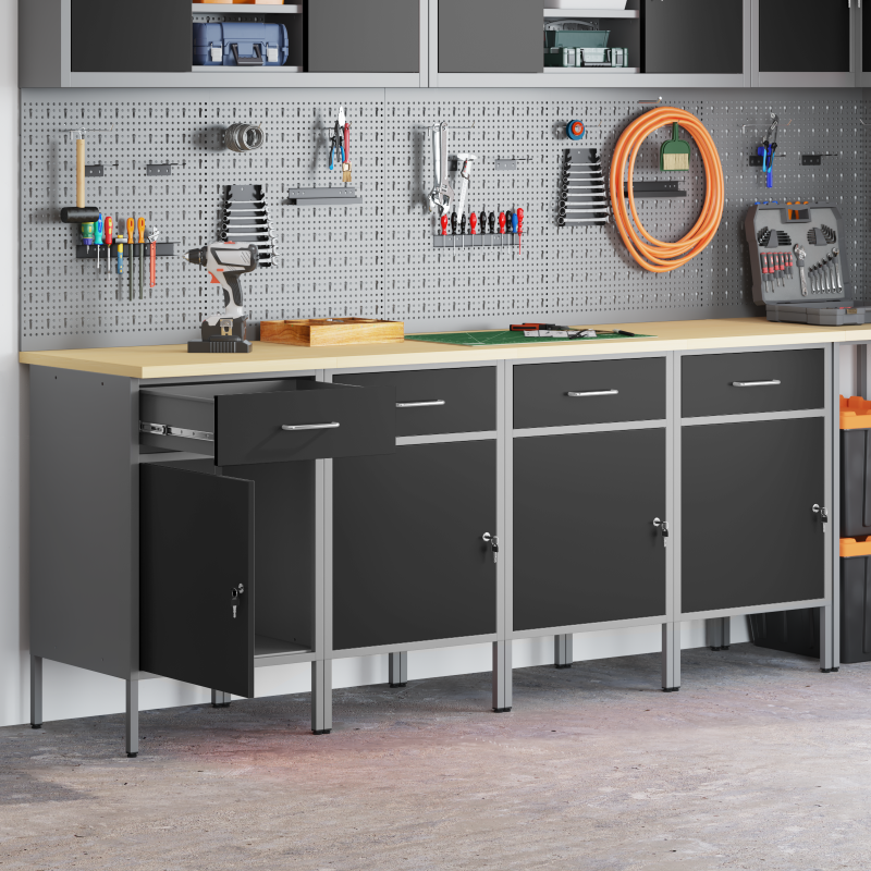 Този модерен работен шкаф без усилие комбинира форма и функция с индустриален стил. Изработен от инженерна дървесина и стомана, той е с уникален правоъгълен дизайн. Подходящ за всякакви хобита и професионална работа, този шкаф е чудесно решение за организиране на инструменти и подобряване на работната атмосфера. Стоманена конструкция: Изработен от инженерно дърво и стомана, този шкаф е здрав и надежден. Въпреки че изглежда масивен, материалите му добавят стил на работното ви пространство. Лесно се поддържа — просто го избърсвате с влажна кърпа. Универсално съхранение: С много отделения, чекмеджета и рафтове, шкафът предлага оптимални решения за съхранение на инструменти и материали. Той е идеален за подреждане на всичко, от големи инструменти до малки аксесоари. Индустриален дизайн: С вдъхновение от градски лофтове, шкафът допълва всякакви съвременни интериори. Неговият индустриален вид е атрактивен и модернизиран. Лесна поддръжка: Поддържането му е просто и удобно. Редовното забърсване е достатъчно, за да изглежда във форма. Лесен монтаж: Сглобяването е лесно и изисква само двама души и отвертка. Подробните инструкции ще улеснят процеса.