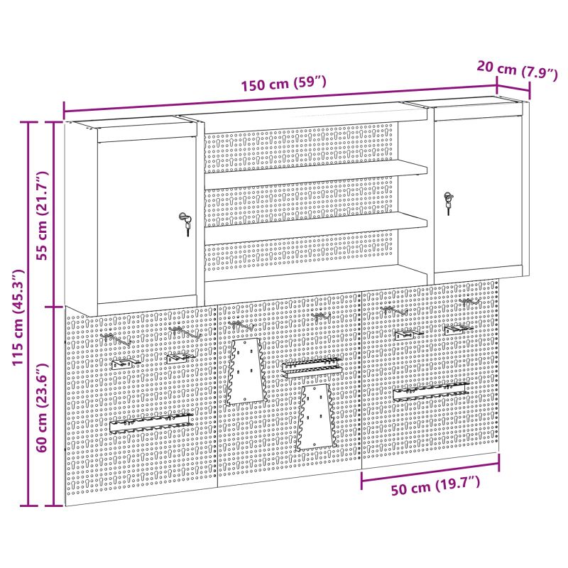 Този универсален комплект за стенен шкаф за инструменти и перфорационна дъска е задължителен за всяка работилница или гараж. С елегантен индустриален дизайн, той носи градски стил с прахово боядисаното желязо и гладкия сив завършек. Предназначен за вътрешна употреба, шкафът предлага надеждно решение за съхранение на инструменти, осигурявайки бърз достъп, а интегрираната перфорационна дъска добавя функционалност с възможност за персонализиране на разпределението на инструментите. Материали: Изработен от здраво прахово боядисано желязо, този комплект шкафове съчетава здравина и стил. Гладката текстура и сивият завършек придават модерен индустриален вид и дълготрайност, а също така се вписват лесно в различни интериорни теми. Обширни компоненти: Комплектът включва метални рафтове от прахово боядисано желязо, осигуряващи стабилно съхранение, което не се отказва при тежест и редовно използване. С перфорационните дъски, потребителите могат лесно да организират инструментите си, оптимизирайки пространството за всякакви видове инструменти. Функционален дизайн и стил: С конструкция, която може да се монтира на стена, шкафът освобождава ценното пространство на пода, което го прави идеален за работилници или гаражи, където е нужна ефективна организация. Това помага в усилията за поддържане на подредено и чисто работно място. Гъвкави възможности за използване: Перфектен за професионални работилници, но и супер удобен за домашни гаражи или DIY пространства. Тази адаптивност позволява на потребителите лесно да се придвижват между различни среди и проекти. Лесни инструкции за поддръжка: Поддържането на шкафа е лесно - просто го бърсиш със суха кърпа, за да запазиш изисканото му изглеждане. Простите стъпки за почистване гарантират продължително задоволство и дълготрайност на шкафа.