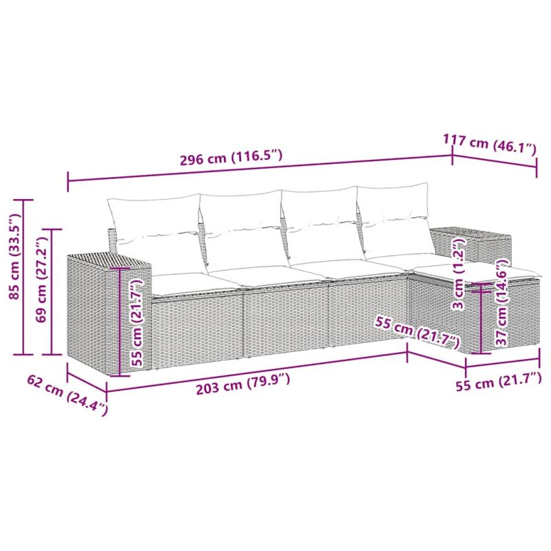 Този градински диван е идеалното допълнение към вашия заден двор, тераса или вътрешен двор, осигурявайки удобно и привлекателно пространство за разговори със семейството и приятелите или просто за почивка и забавление на открито. Издръжлив материал: PE ратан, известен също като полиратан, е здрав синтетичен материал с малко необходима поддръжка, който прилича на естествен ратан. Той е лек, лесен за почистване и често се използва за външни мебели поради своята издръжливост и устойчивост на атмосферни влияния.Функция за съхранение с водоустойчива чанта: Градинската мебел разполага с място за съхранение под седалката, допълнено с водоустойчива чанта за съхранение на възглавници, играчки и други предмети. Вътрешната чанта може да бъде здраво закрепена към външната мебел със закопчалки за допълнителна стабилност.Универсална табуретка за крака: Табуретката е универсална и служи като удобна поставка за крака, когато се излежавате на дивана или като допълнителна седалка във вашата градина.Калъф, който може да се сваля и може да се пере: Тези възглавници за седалки имат подвижни калъфи за лесно пране и поддръжка.Модулен дизайн: Този комплект външни мебели има модулен дизайн, което го прави напълно гъвкав и лесен за преместване, така че можете да създадете персонализирана подредба на външни мебели. Добре е да се знае:За да сте сигурни, че вашите външни мебели ще останат красиви, ви препоръчваме да ги защитите с водоустойчиво покривало.