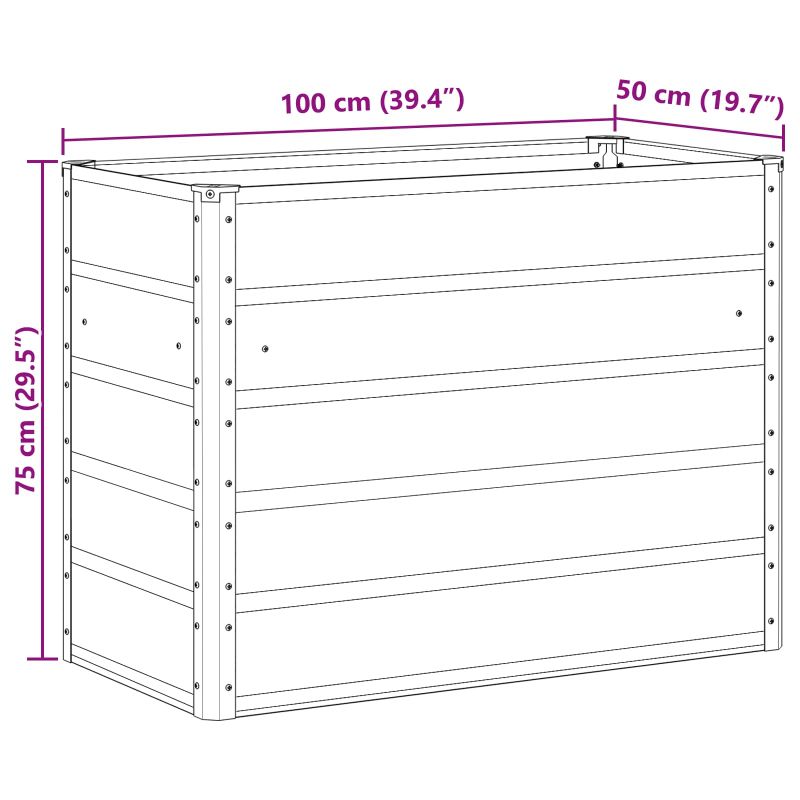 Тази цветна стоманена саксия в индустриален стил внася модерен щрих в градината или терасата. Тя съчетава функционалност с визуална привлекателност. Изработена от поцинкована стомана, тя гарантира дълготрайна употреба, съчетавайки автентично индустриално излъчване. Солидният ѝ дизайн я прави идеална за открити пространства, допълвайки както съвременни, така и традиционни обстановки. Здрава поцинкована стомана: Изработена с прецизност, поцинкованата стомана осигурява трайност на саксията и устоява на климатични условия. Независимо от необработения си завършек, тя придава модерен индустриален вид. Включени компоненти: Саксията е готова за употреба и безпроблемно побира разнообразни растения. Минималистичният ѝ дизайн е идеален за градски и селски открит пространства. Лесна сглобка: За сигурност, сглобяването изисква двама души и отвертка. Простият процес гарантира, че саксията ще бъде стабилна при вятър или други условия. Универсална употреба на открито: Специално проектирана за градини и тераси, тази стоманена саксия преобразява всяко открито пространство. Нейната гъвкавост я прави подходяща за различни растения и градински декорации. Поддръжка и обгрижване: Лесно е да поддържате саксията в перфектен вид. Периодичното ѝ почистване предотвратява натрупването на мръсотия и отломки, удължавайки изчистения ѝ вид. Предупреждение! Трябва да носите защитни ръкавици. Моля, носете защитни очила, ръкавици, защитни обувки и защита за главата при инсталиране на саксията.