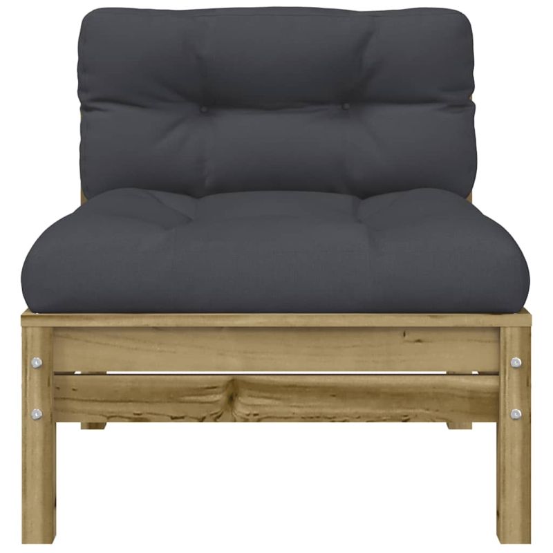 Това 2-местно дървено градинско кресло с възглавници и табуретка ще бъде страхотно допълнение към вашата градина, тераса или вътрешен двор за разговори със семейството и приятели или просто за наслаждаване на времето. Импрегнирана дървесина: Масивната борова дървесина е красив естествен материал. Боровата дървесина е с продълговати шарки, а чеповете придават на материала характерния му рустик вид. Импрегнирането е процес на запазване, който се извършва с помощта на автоклави. Обработката под налягане повишава устойчивостта на гниене и атмосферни влияния.Удобна седалка: Облегалката и подплатените възглавници правят градинския диван по-удобен за сядане.Разнообразна употреба: Тази външна табуретка за крака може да се използва не само за сядане или отпускане на краката ви, но може да се използва и като масичка за кафе, за да държите вашите напитки, храна и други декорации.Дизайн с ламели: Конструкцията с ламели на палетния диван ефективно предотвратява събирането на вода, като гарантира, че седалката ще остане суха и няма да изгние.Модулен дизайн: Дървеният градински диван има модулен дизайн, което го прави напълно гъвкав и лесен за преместване, за да пасне на всяка обстановка. Можете да комбинирате различни модулни елементи, налични в падащото меню, за да създадете собствени конфигурации на градинска зона за отдих! Добре е да се знае:За да сте сигурни, че вашите външни мебели ще останат красиви, ви препоръчваме да ги защитите с водоустойчиво покривало.