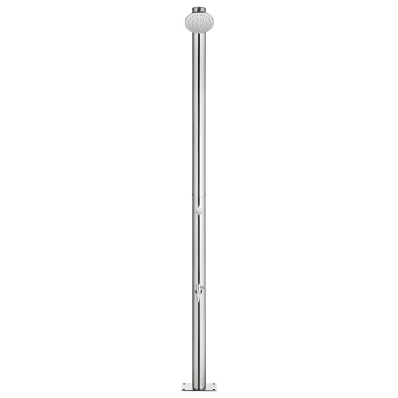 Този градински душ, отличаващ се с модерен дизайн, е предназначен да се превърне в чудесно допълнение към вашия плувен басейн и други външни жилищни пространства. Външният душ е изработен от неръждаема стомана, което го прави устойчив на атмосферни влияния. Душ системата разполага с душ глава и кран за измиване на краката, за да отговори на нуждите ви за градинарство, поливане и бърз душ. Издръжливата и устойчива на корозия душ основа е изработена от първокласен WPC и рамкирана от неръждаема стомана с матирано покритие, което гарантира трайност за години на употреба. Душът също така предлага най-високото ниво на хигиенна защита, което го прави идеален за вашето открито пространство. Благодарение на своята здравина и гъвкавост душ основата може да служи и като основа за стълба на басейна. Потопете се в истински релаксиращо водно усещане и се насладете на модерния стил на тази градинска душ система!
