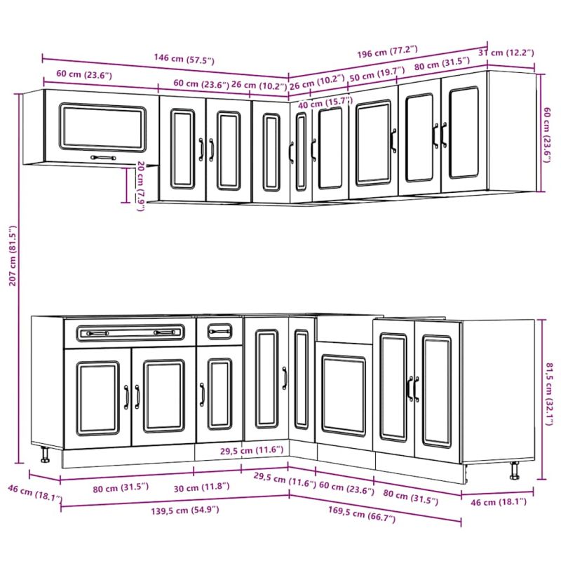 Този комплект кухненски шкафове от 11 части с елегантния си дизайн оптимизира кухненското ви пространство и осигурява достатъчно място за съхранение на вещите ви! Стабилен и издръжлив материал: Инженерната дървесина е издръжлив и стабилен материал с гладка повърхност, която е устойчива на влага, изкривяване и разцепване, което я прави надежден избор за различни проекти.Голямо пространство за съхранение: Комплектът кухненски шкафове има много отделения и предлага достатъчно място за съхранение на купи, чинии, тенджери и други кухненски уреди.Регулируеми крачета: Долните шкафове са снабдени с регулируеми крачета, чиято височина може да се регулира според разположението на кухнята.Лесна поддръжка: Благодарение на гладката си повърхност тези кухненски шкафове се почистват лесно с влажна кърпа и изискват по-малко поддръжка. Внимание:За да предотвратите преобръщане, този продукт трябва да се използва с предоставеното устройство за закрепване на стена. Добре е да се знае:Винт(ове) и щепсел(и) за вътрешността на стената не са включени. Търсете и използвайте винт(ове) и дюбел(и), подходящи за вашите стени. Ако не сте сигурни, потърсете професионална помощ. Прочетете и следвайте внимателно всяка стъпка от инструкциите.Работният плот, мивката и смесителят не са включени в доставката.