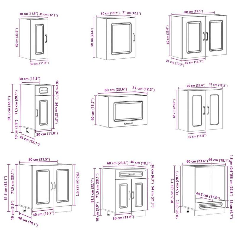 Този комплект кухненски шкафове от 14 части, с елегантния си дизайн, оптимизира кухненското ви пространство и осигурява достатъчно място за съхранение на вашите лични вещи! Стабилен и издръжлив материал: Инженерната дървесина е издръжлив и стабилен материал с гладка повърхност, устойчива на влага, деформация и цепене, което го прави надежден избор за различни проекти.Достатъчно място за съхранение: Комплектът кухненски шкафове има много отделения и предлага достатъчно място за съхранение на купи, чинии, тенджери и други кухненски уреди.Регулируеми крачета: Долните шкафове разполагат с регулируеми крачета, които могат да се регулират по височина, за да отговарят на оформлението на вашата кухня.Лесни за поддръжка: Благодарение на гладката си повърхност, тези кухненски шкафове се почистват лесно с влажна кърпа и изискват по-малко поддръжка. Предупреждение:Този продукт трябва да бъде обезопасен чрез монтиране на работен плот. Подходящ за имайте предвид:Винт(ове) и дюбели за вътрешната част на стената не са включени. Потърсете и използвайте винт(ове) и дюбели, подходящи за вашите стени. Ако не сте сигурни, потърсете професионален съвет. Прочетете и следвайте внимателно всяка стъпка от инструкциите.Плотът, мивката и смесителят не са включени в доставката.
